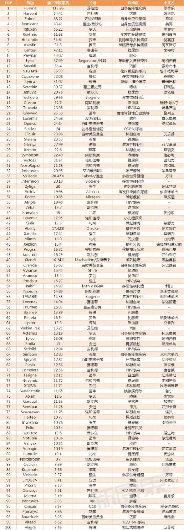 2016年第三季度已經落下帷幕,通過對各醫藥公司的研究,下面將對第三季度全球藥物銷售額100強進行盤點。與上半年百強的榜單(相關閱讀:2016年上半年全球藥物銷售額100強)相比,新面孔有3個:吉利德的抗HIV藥物Genvoya以及Viread,強生的抗腫瘤藥物Imbruvica,另外強生的另一款抗腫瘤藥物Zytiga是排行榜中上升最快的藥物,從45位上升到35位。