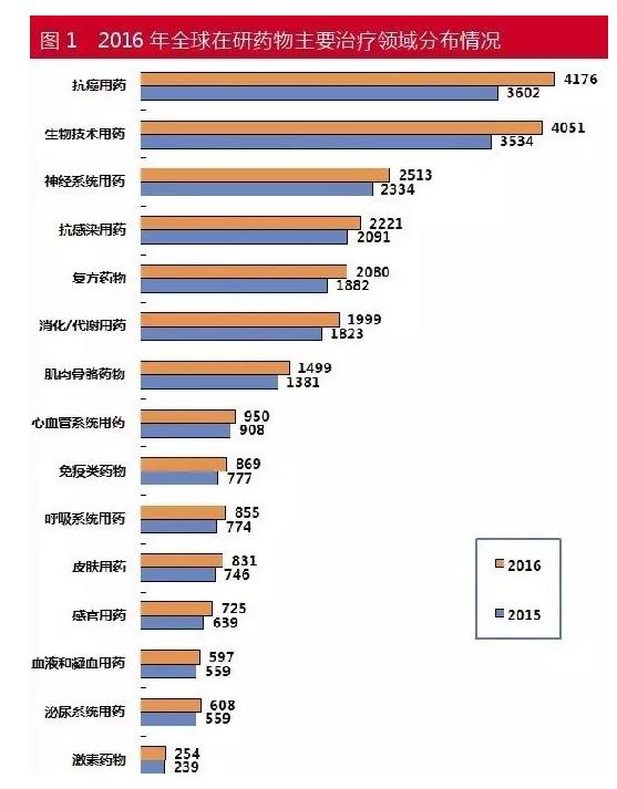 按照16個主要治療領域對在研新藥項目進行分類時發現,2016年各治療領域的在研新藥數量基本呈現增長態勢。通過Pharmaprojects/Pipeline數據庫數據,可對16個主要治療領域以及生物技術類別的在研藥物情況進行分析。